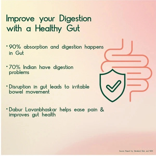 Dabur Lavanbhaskar Churna is an Ayurvedic formulation made with selected salts that can help reduce indigestion and acidity. It has a tangy taste that helps improve appetite in cases of loss of taste. It is also beneficial for constipation and irregular bowel movements.