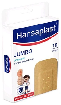 Hansaplast Jumbo Strip is a plastic plaster suitable for covering wounds and bruises. The jumbo strip helps keep away septic problems and is rough and tough in use.