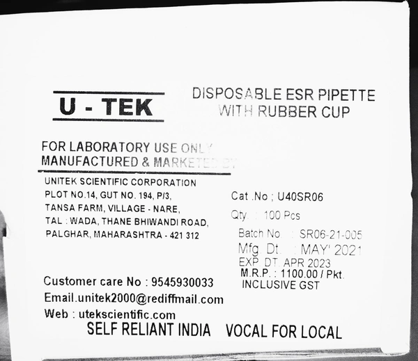 Disposable ESR Pipette with Rubber cap